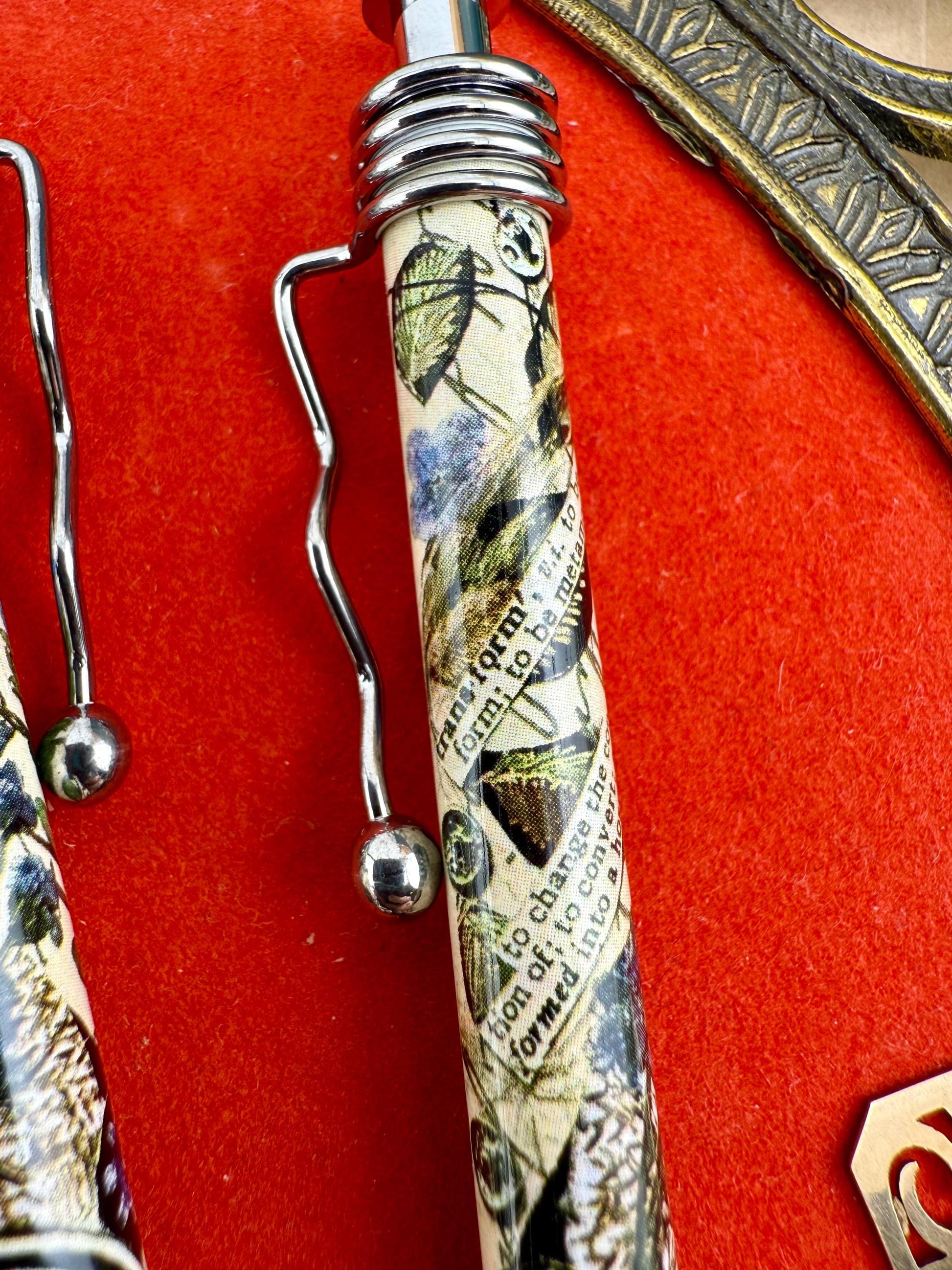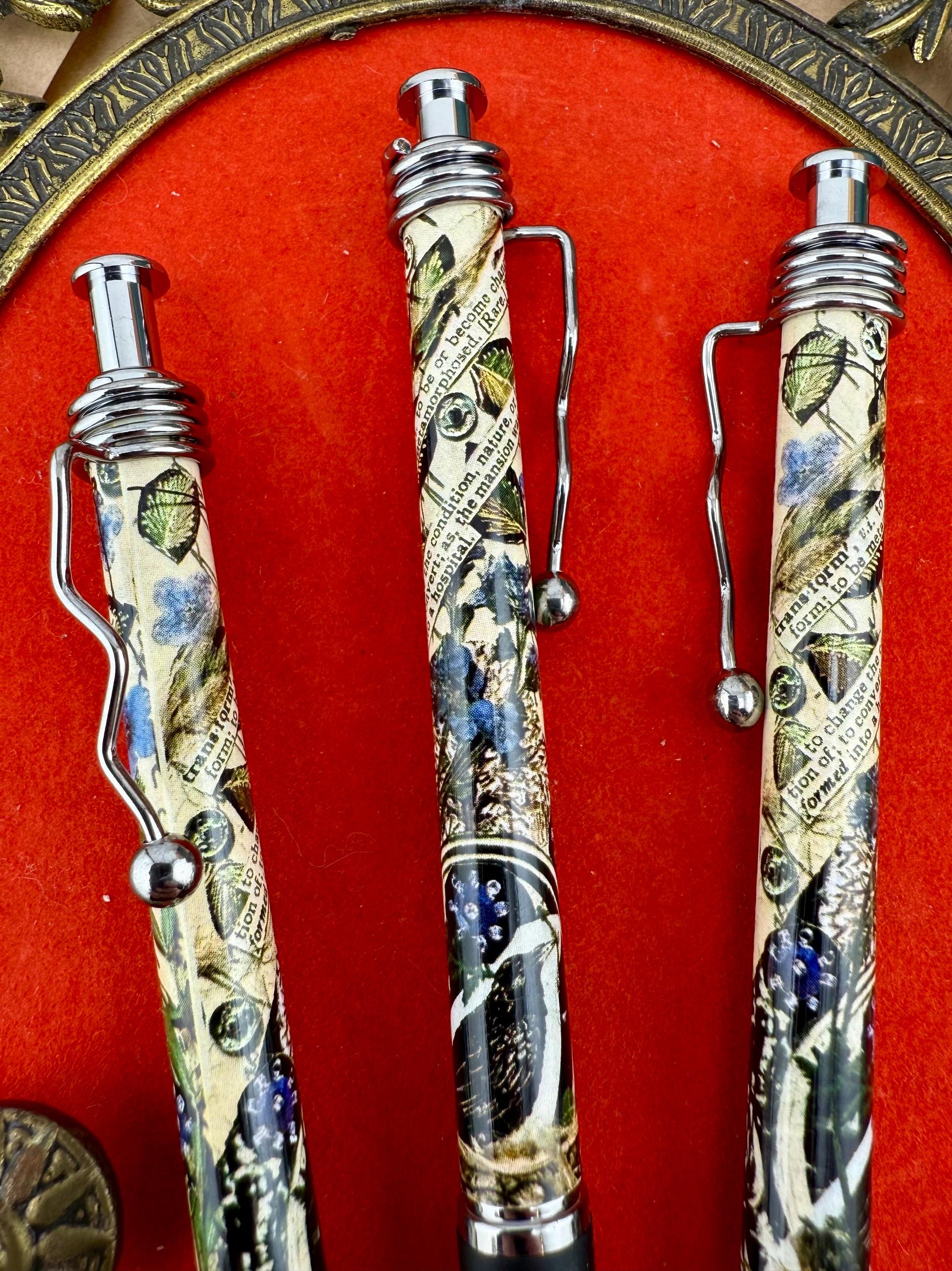 ✨Details: - Black ink ballpoint pen w/ squiggle clip - Refillable, smooth writing, and satisfyingly clicky - Unique, small batch printing of original handmade collage art made & owned by Corkscrew Curiosities.