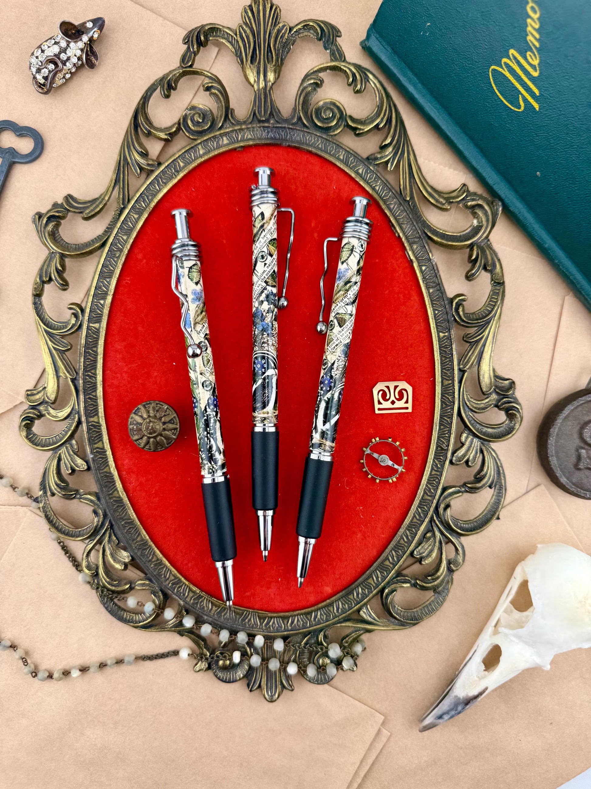 A pen for the crow-brained: the ones who gather scraps of meaning like shiny things, who scribble thoughts just to see what they become. This design wrapped pen features a high-quality print of original handmade collage artwork, featuring botanical elements, dark florals, glints of sewing notions, and a vigilant blackbird watching from its nest of chaos.